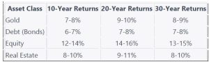 People put their money in different assets, like gold, real estate, or the stock market (equity). Some think gold and houses are the best, but, stocks have been the best choice in India over the past few decades. Here’s a table showing how different things have performed: 4. Goal-Based Plans: