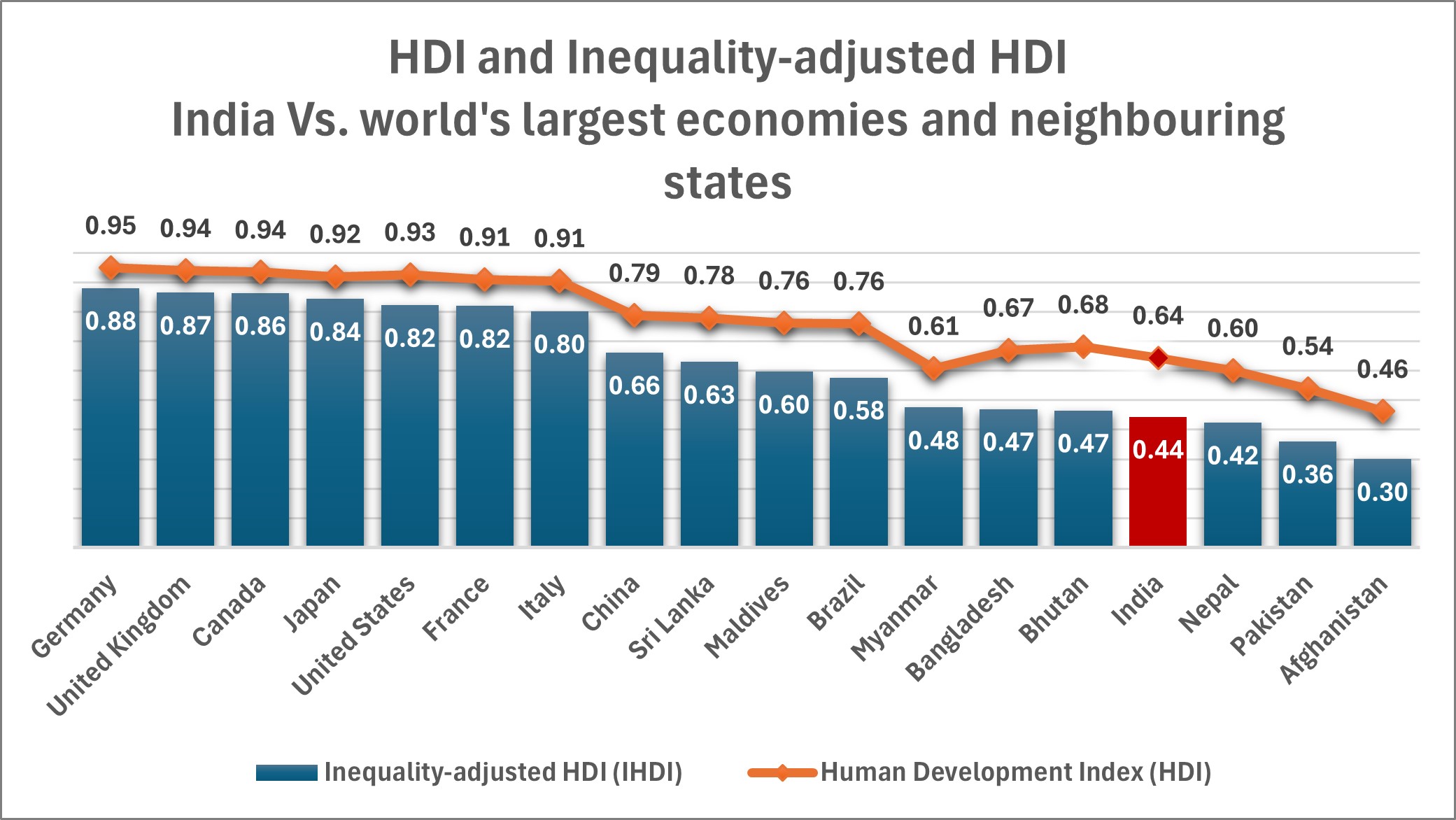 As previously stated, IHDI is calculated using HDI after accounting for the country’s inequalities in these three dimensions. If there is no inequality among people in a country, the IHDI equals the HDI. As inequality increases, IHDI falls below HDI. The chart below depicts the overall drop in IHDI due to inequality for India, as well as the world’s largest economies and neighbours.