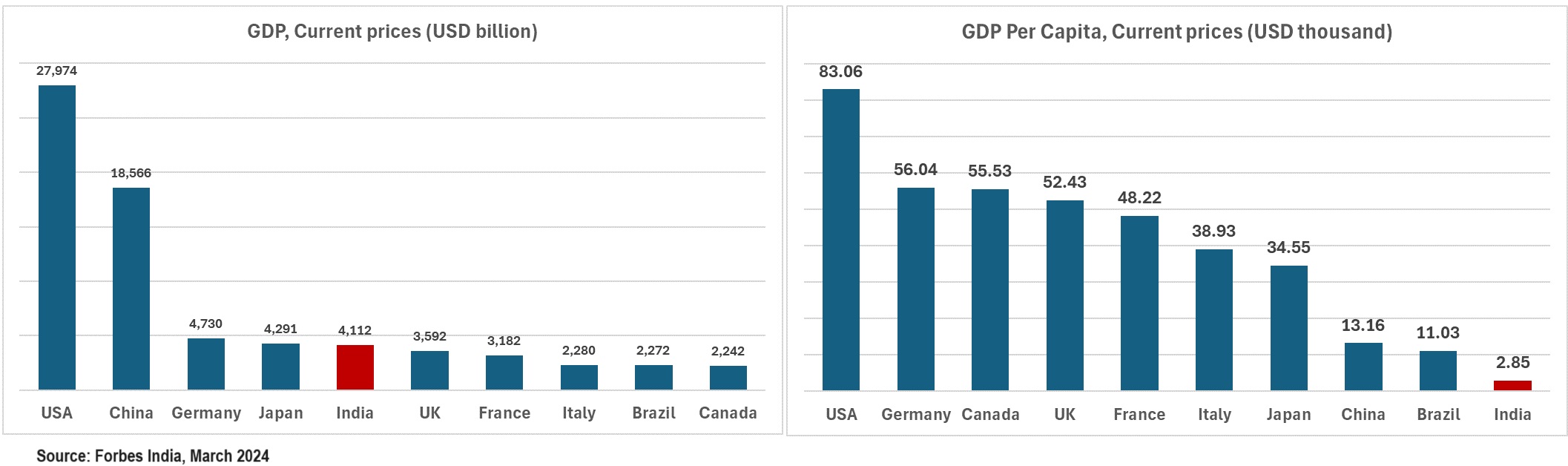 Despite being the world’s fifth largest economy, India’s GDP per capita is low when compared to the top ten economies (see below). This is obviously reflected in its human development record.