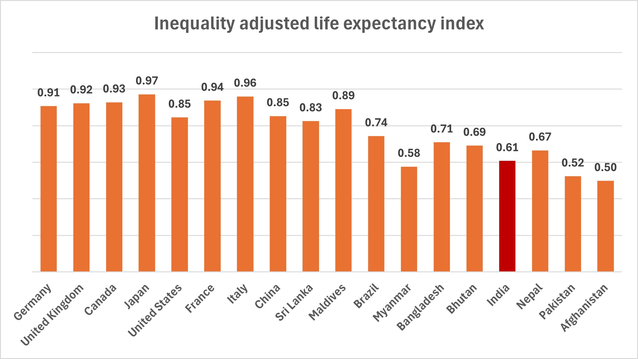 Only Nepal, Bhutan, Pakistan, and Afghanistan have a lower inequality-adjusted life education index than India among its neighbors.