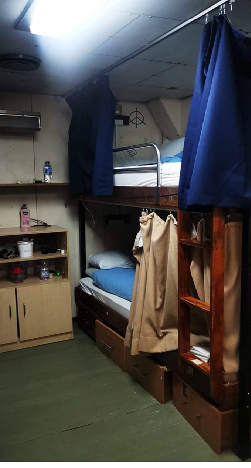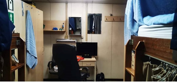 ഒരു മുറിയിൽ നാല് പേരാണ് താമസിക്കുന്നത്. ; രണ്ടാളുകൾ മുകളിലും രണ്ട് പേർ താഴെയും. പുതിയ ബാർജുകളിൽ രണ്ട് പേര് ഒരു മുറിയിൽ എന്നതാണ് കണക്ക്.