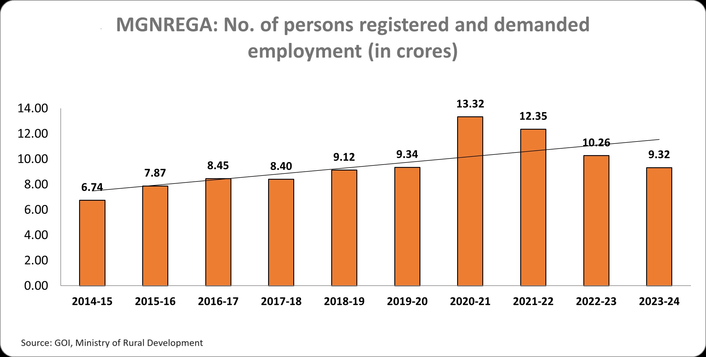 The number of households looking for work increased dramatically in 2020-21 due to the economic distress caused by the pandemic and lockdown. So, as the economy improved, the number of MGNREGA job seekers fell in subsequent years when compared to 2020-21. However, these figures remain higher than in 2019-20, just before the pandemic. In other words, the trend of increasing job seekers under MGNREGA persists.