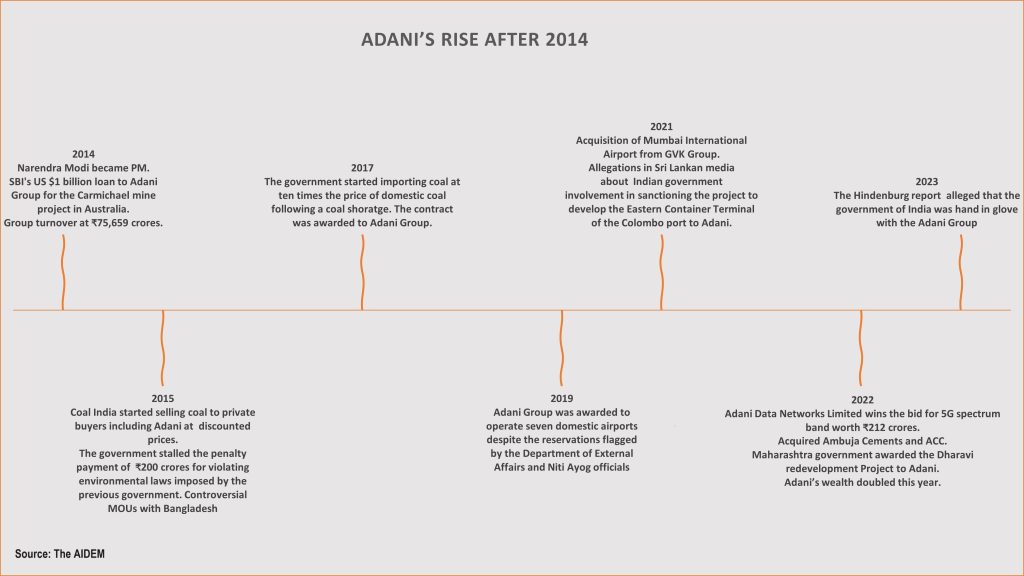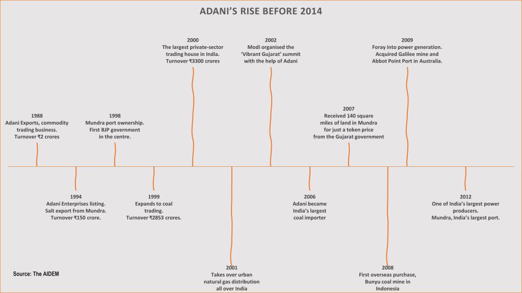 ഗൗതം അദാനിയുടെയും അദാനി എന്റര്പ്രൈസസ് എന്ന വ്യവസായ സാമ്രാജ്യത്തിന്റെയും ഉദയം നരേന്ദ്രേ മോദിയെന്ന ഭരണാധിപന്റെ വാഴ്ചക്കാലവുമായി പ്രത്യക്ഷത്തില്തന്നെ ബന്ധമുണ്ടെന്നത് ഇന്ന് എല്ലാവര്ക്കും അറിവുള്ള കാര്യമാണ്. 2001ല് ഗുജറാത്ത് മുഖ്യമന്ത്രിയായി ഭരണത്തിലേറിയ നാള്തൊട്ട് പ്രധാനമന്ത്രിയായി ഒരു ദശകം പൂര്ത്തിയാക്കുന്നതുവരെയുള്ള കാലയളവില് ഗൗതം അദാനി കൈവരിച്ച സാമ്പത്തിക വളര്ച്ചയിലേക്ക് വെറുതെയൊന്ന് കണ്ണോടിച്ചാല്ത്തന്നെ ഇക്കാര്യം ബോധ്യപ്പെടാവുന്നതാണ്. 2002ല് കേവലം 3741കോടി രൂപ വാര്ഷിക വിറ്റുവരവ് ഉണ്ടായിരുന്ന അദാനി എന്റര്പ്രൈസസ് 2014 ആയപ്പോഴേക്കും 75,659 കോടി രൂപ വിറ്റുവരവുള്ള വ്യവസായ സ്ഥാപനമായി ഉയര്ന്നുകഴിഞ്ഞിരുന്നു. ഗുജറാത്തിലെ മുണ്ഡ്ര തുറമുഖം ഏറ്റെടുക്കുന്നതിലൂടെ തുറമുഖ ബിസിനസ്സിലേക്ക് കാലെടുത്തുവെച്ച അദാനി പിന്നീട് ഇന്ത്യയിലെ ഭൂരിപക്ഷം തുറമുഖങ്ങളും വിമാനത്താവളങ്ങളും കല്ക്കരി ഖനികളും ഊര്ജ്ജോത്പാദന നിലയങ്ങളും ഉള്ള വന്കിട ബിസിനസ് സാമ്രാജ്യമായി മാറിയതും നാം കണ്ടു.