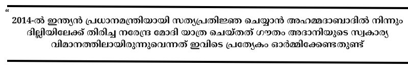 2014-ല് ഇന്ത്യന് പ്രധാനമന്ത്രിയായി സത്യപ്രതിജ്ഞ ചെയ്യാന് അഹമ്മദാബാദില് നിന്നും ദില്ലിയിലേക്ക് തിരിച്ച നരേന്ദ്ര മോദി യാത്ര ചെയ്തത് ഗൗതം അദാനിയുടെ സ്വകാര്യ വിമാനത്തിലായിരുന്നുവെന്നത് ഇവിടെ പ്രത്യേകം ഓര്മ്മിക്കേണ്ടതുണ്ട്. പിന്നീട് പ്രധാനമന്ത്രിയെന്ന നിലയില് മോദി നടത്തിയ എല്ലാ വിദേശയാത്രകളിലും ഗൗതം അദാനിയുടെ വ്യവസായസാമ്രാജ്യത്തിന്റെ പ്രതിനിധികളും അകമ്പടി സേവകരായി ഉണ്ടായിരുന്നുവെന്നതും ഓര്ക്കുക.