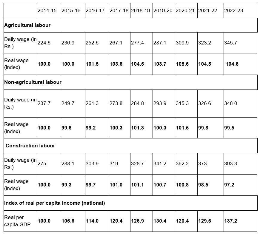 - In 2022–23, the daily wage of an agricultural worker was only 2/3rd of per capita income of the country on an annualised manner. The per capita income grew approximately nine times faster than the real wage of these workers, suggesting that the income inequality gap is widening very fast.