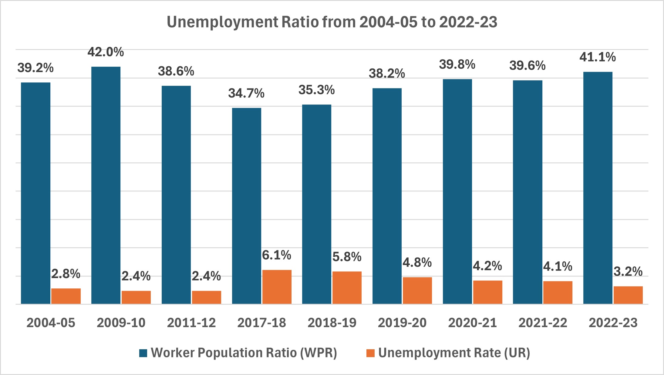 - Although the worker population ratio (WPR) remained relatively stable, the unemployment rate (UR) increased dramatically from 2014 to 2019, peaking in 2017-18 due to demonetization.