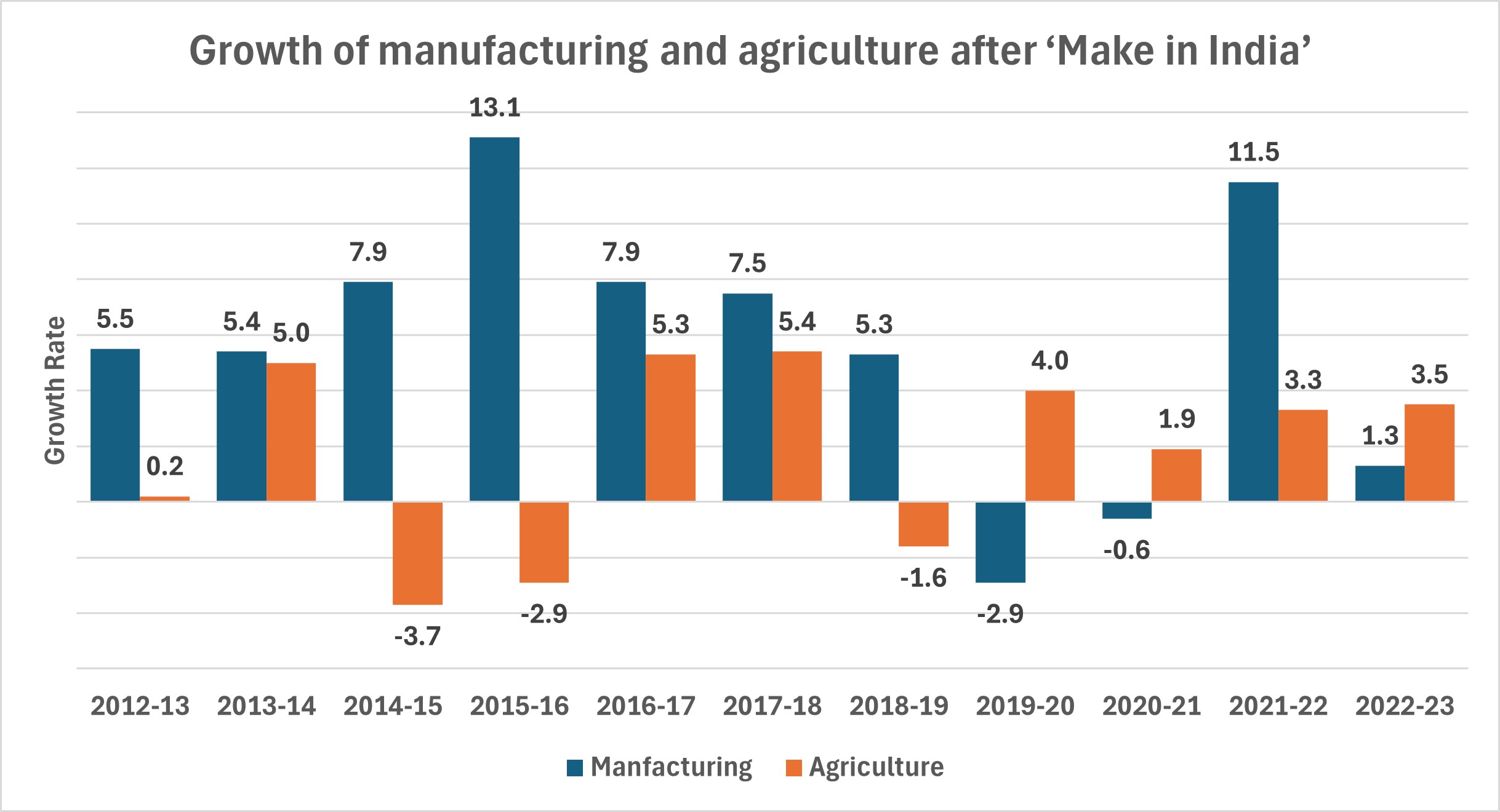 - Make in India has had no positive impact on the rate of growth in manufacturing.