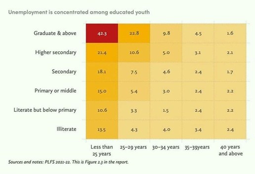 The data from the Periodic Labour Force Survey (2021-22) shown below demonstrate the dire state of employment in India.