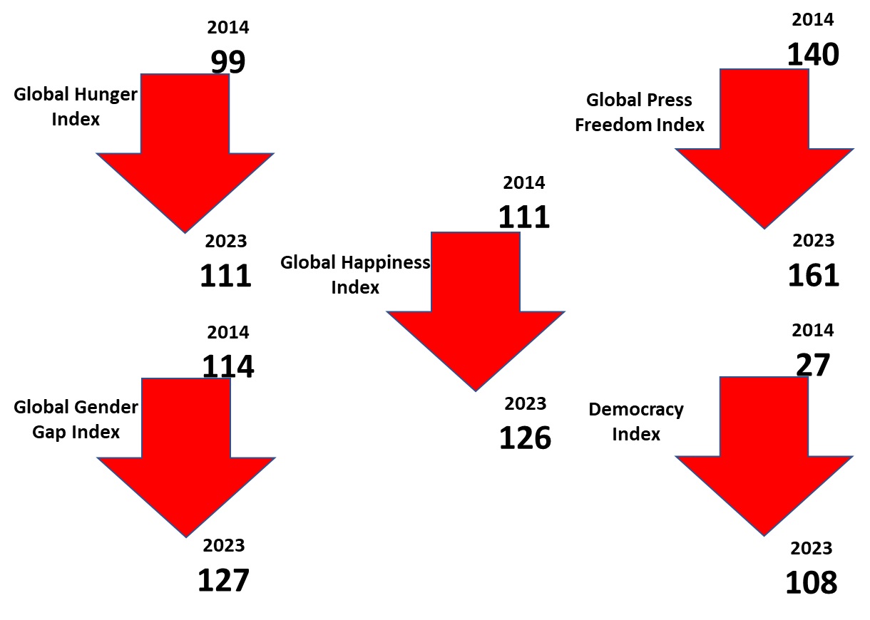 The NDA government came to power under Mr. Narendra Modi in 2014, and they were re-elected in 2019. The key pillars of Mr. Modi’s campaign have been Achche Din (better days), Sabka Saath, Sabka Vikas (inclusive development), and Na Khaunga aur Na Khane Dunga (eliminate corruption). With electoral bonds declared unconstitutional and numerous analyses now available in the public domain demonstrating how electoral bonds were used for extortion, money laundering, and quid pro quo deals, the narrative of “Na Khaunga aur na Khane denge” has unraveled. Let us take a closer look at the first two narratives.