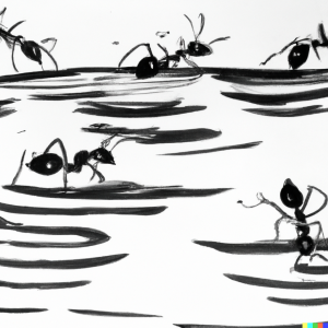 പക്ഷെ ഉറുമ്പാവട്ടെ ഒഴുകിയെത്തുന്ന പ്രളയജലത്തിൽ നിന്നും നൊടിയിടയിൽ ഒഴിഞ്ഞുമാറി കുപ്പിയുടെ വെള്ളമൊഴിഞ്ഞ ഭിത്തിയിൽ അള്ളിപ്പിടിച്ചിരുപ്പായി…