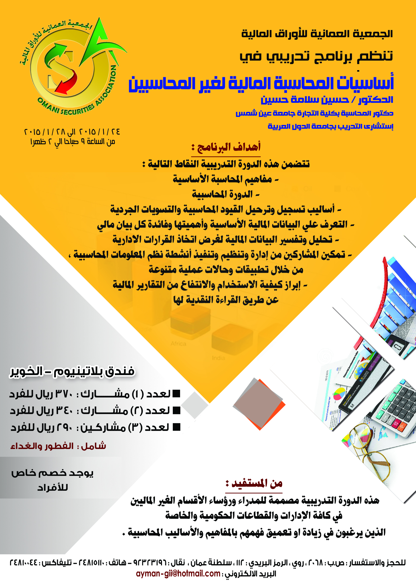 برنامج أساسيات المحاسيبة لغير المحاسبين تنظمه الجمعية العمانية للأوراق المالية خلال الفترة من 24 الى 28 يناير بفندق بلاتينيوم الخوير . الأستاذ المحاضر الدكتور / حسين سلامة . دكتور المحاسبة بكلية التجارة جامعة عين شمس إستشاري التدريب بجامعة الدول العربية . الدعوة للجميع لمن يرغب بالمشاركة وفق التفاصيل الموضحة بالبروشور المرفق