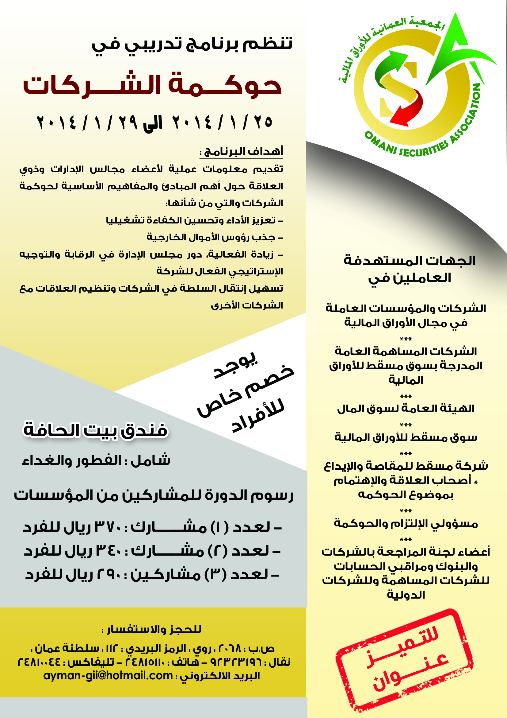 يسر الجمعية العمانية للأوراق المالية دعوتكم لترشيح من ترونه مناسباً لحضور البرنامج التدريبي في ( حوكمة الشركات Corporate Governance ) والمقرر عقده خلال الفترة من 25 الى 29 يناير 2015م . هذا البرنامج له أهمية كبيرة في تنظيم عمل المؤسسات وإيجاد التطبيقات والممارسات السليمة للقائمين على إدارة الشركة بما يزيد من كفاءة استخدام الموارد وتعظيم قيمة الشركة وتدعيم تنافسيتها بالاسواق وما يمكنها من جذب مصادر تمويل للتوسع والنمو ويجعلها قادرة على خلق فرص عمل جديدة ويجعلها تحافظ على حقوق حملة الأسهم بالشركة وأصحاب المصالح. ملاحظة : يوجد خصم خاص للأفراد .